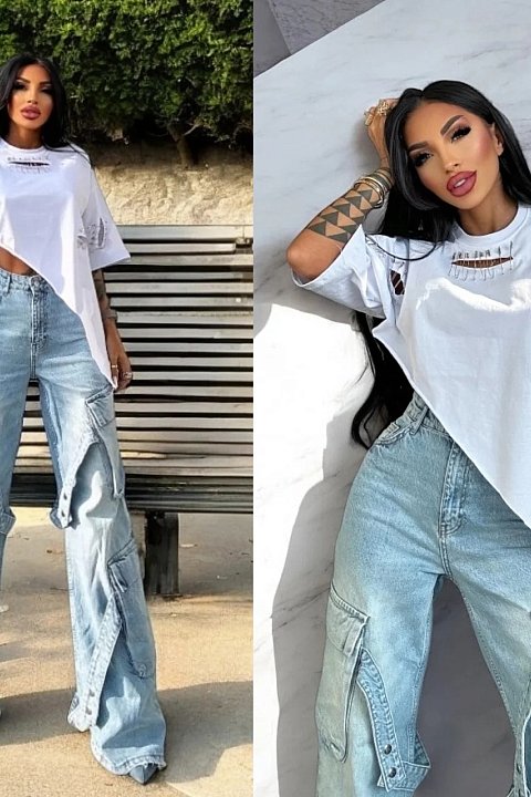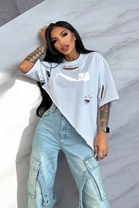 Elevate your style with this oversized white tee, featuring an asymmetric design and unique details. The strategic cuts are embellished with metallic pins, creating a grunge-chic effect perfect for those who love to stand out. The relaxed fit ensures absolute comfort, while the asymmetric cut adds a touch of originality. Wear it with cargo jeans or tight leggings for an irresistible streetwear outfit.